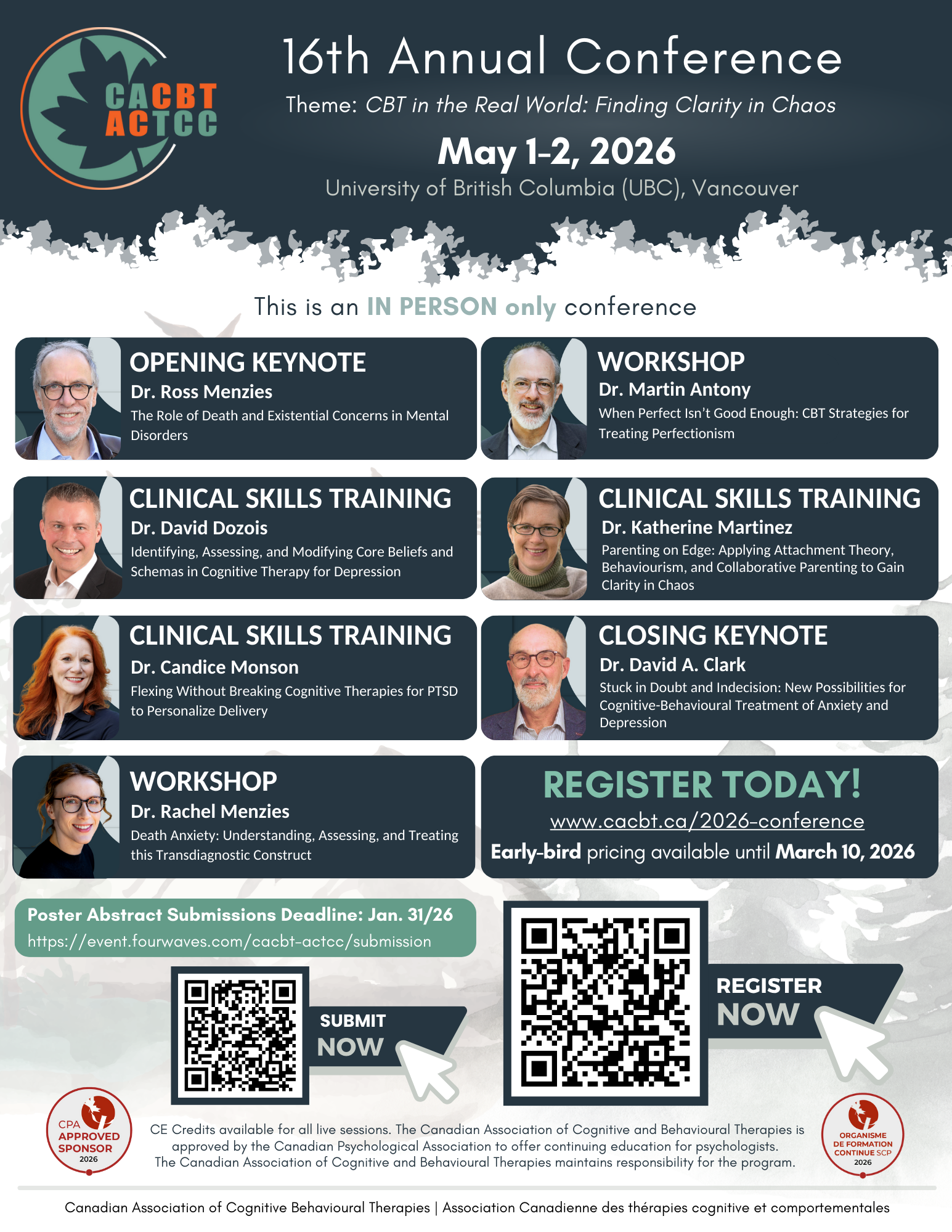 Enfin, il s’agit d’un moment important pour choisir le Canada et soutenir des soins de santé fondés sur les données probantes ici même au pays. Dans un contexte d’incertitude mondiale, soutenir des congrès canadiens contribue à la vitalité de la TCC au Canada en renforçant notre communauté professionnelle et en favorisant la collaboration au sein de notre système de santé. Après plusieurs années de formats hybrides, ce congrès entièrement en présentiel recentre nos efforts sur la connexion et la collaboration entre praticiens et praticiennes — des éléments plus essentiels que jamais pour soutenir l’avenir des pratiques fondées sur les données probantes au Canada.